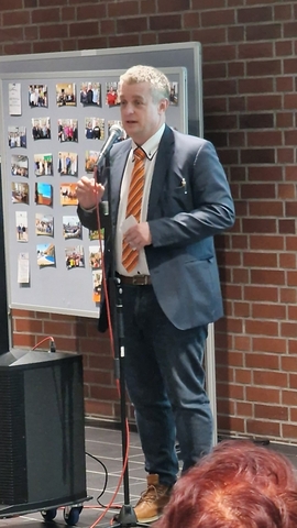 [Bild links: Thomas Sohler bei seinem Rechenschaftsbericht | Bild Mitte: Zur Begrüßung spricht Ingo Stechmann, kommissarischer Leiter des Staatlichen Schulamts | Bild rechts: Hausherr und Schulleiter Tobias Diehl mit Ingo Stechmann im Gespräch]