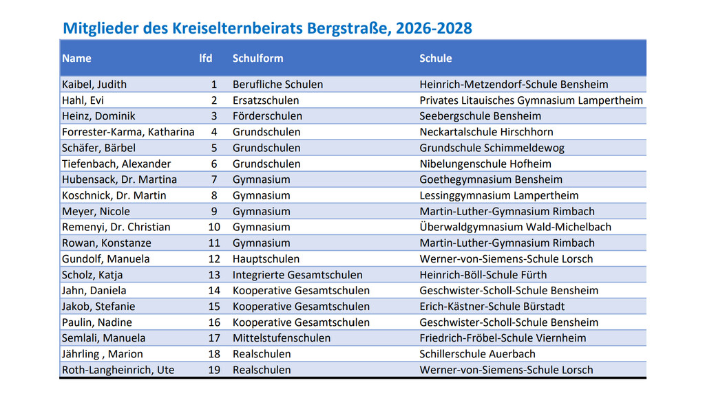 Für mich persönlich endet mit dieser Wahl meine Zeit als Vorsitzender des Kreiselternbeirats. Ich bin dankbar für das Vertrauen, die vielen Begegnungen und die gemeinsame Arbeit für Eltern, Schülerinnen und Schüler im Kreis Bergstraße.